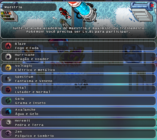 Feito isso, o treinador deve falar com o NPC responsável pelo determinado clã, que se encontra na área mais ao norte da sala da Mastery, conforme a imagem abaixo, e deverá pagar 100 pontos para ter a chance de ser aceito: os 100 pontos são contabilizados por meio das plates que representam os elementos da Mastery e cada plate vale 10 pontos.